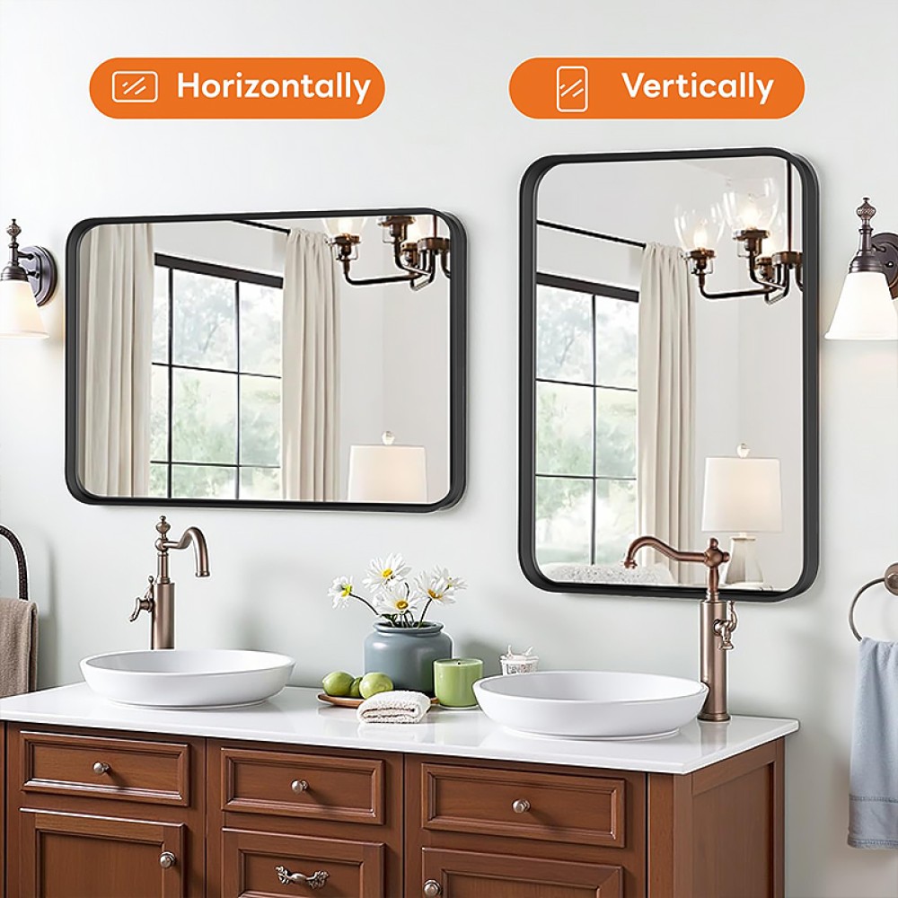Superior Durability: Features a matte black aluminum alloy rounded rectangular frame, exuding a modern and elegant look. The frame is treated with an anodizing process, making it waterproof, rustproof, moisture-proof, and resistant to deformation, especially suitable for the high-humidity environment of the bathroom. Aesthetically pleasing and safe: The rounded corners are soft and non-sharp, reducing the risk of injury from collisions and enhancing safety. The rectangular mirror's harmonious proportions not only offer a wide range of practical uses but also enhance the sense of depth, making bathrooms or bedrooms appear more spacious and tidy.