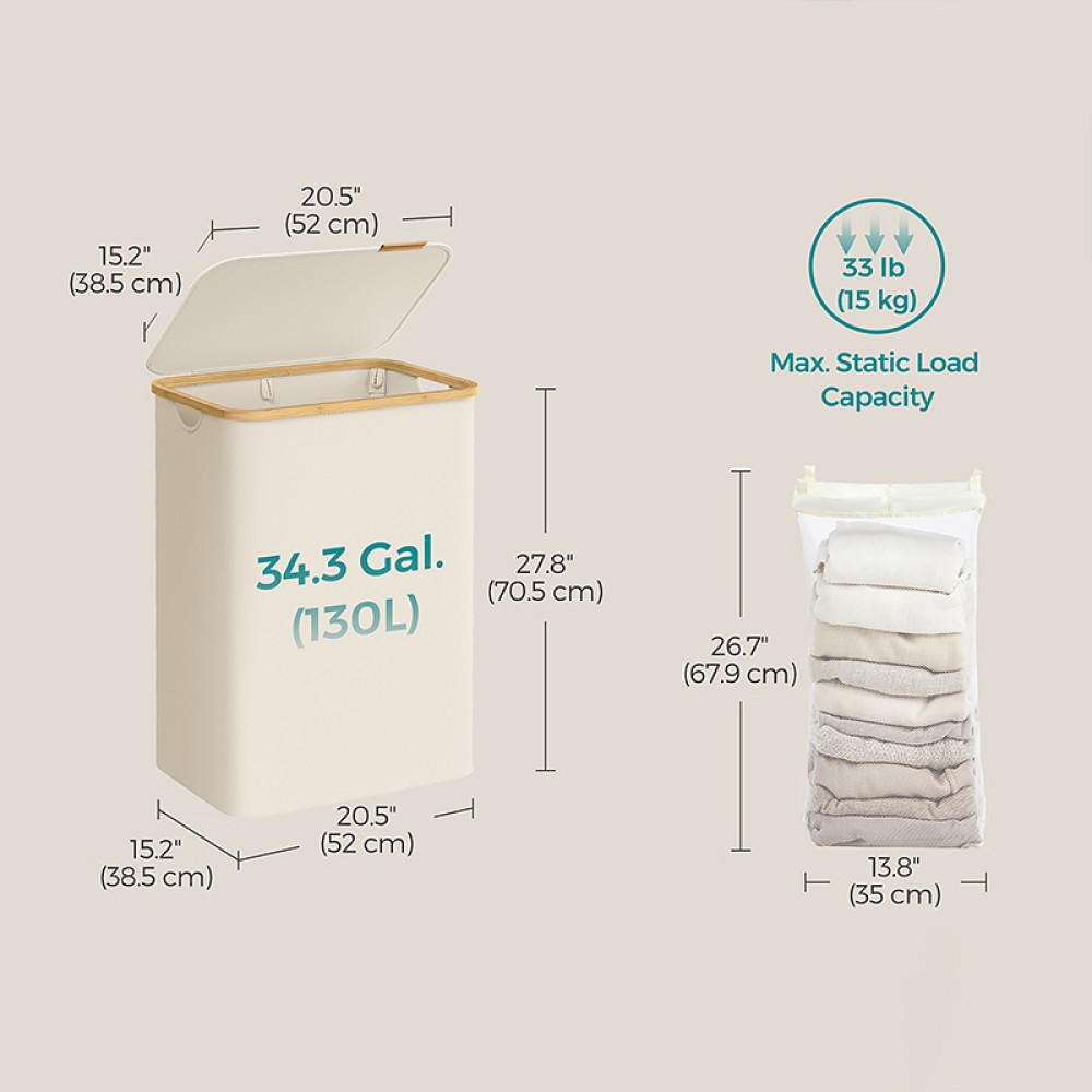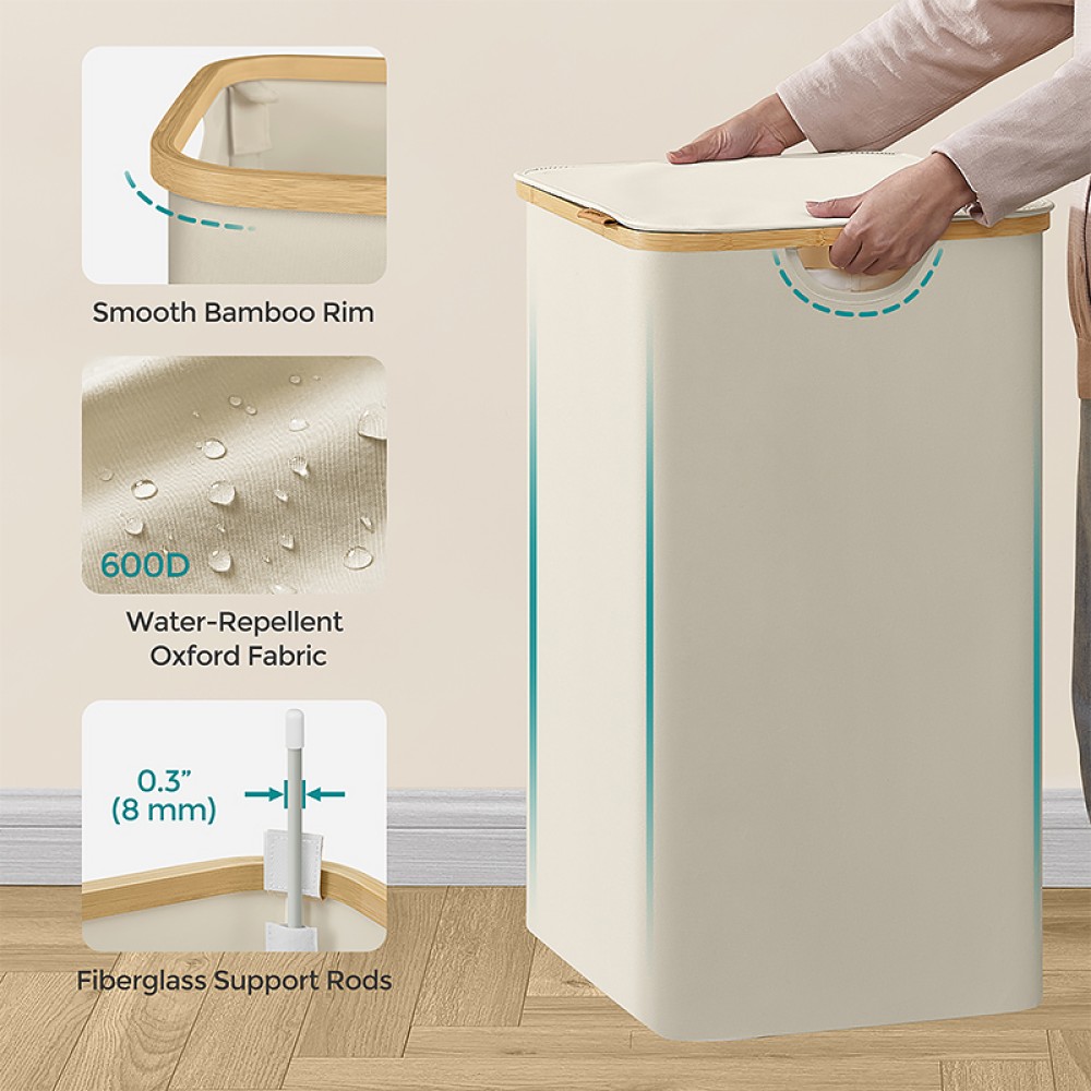 Easy to Use: The lid is designed for easy one-handed operation, allowing for convenient loading and unloading even when fully loaded. The reasonable height and structural design make daily use easier and more suitable for bedrooms, bathrooms, or laundry rooms. Natural texture and versatility: Combining natural bamboo with a minimalist design, this product is both functional and decorative. Suitable for bedrooms, bathrooms, laundry rooms, balconies, and more, it adds a touch of natural freshness to any space.